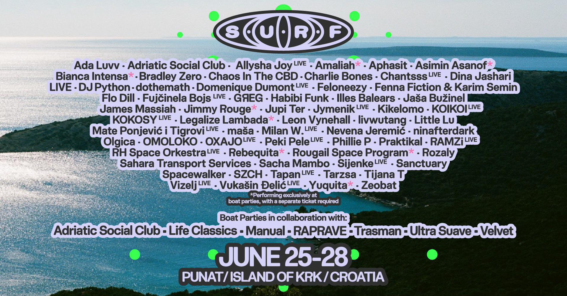 Surf Festival brings together music, summer atmosphere, and a coastal setting in Punat. In addition to the main stages, special boat party performances are part of the program, featuring artists marked for exclusive sets requiring separate tickets.