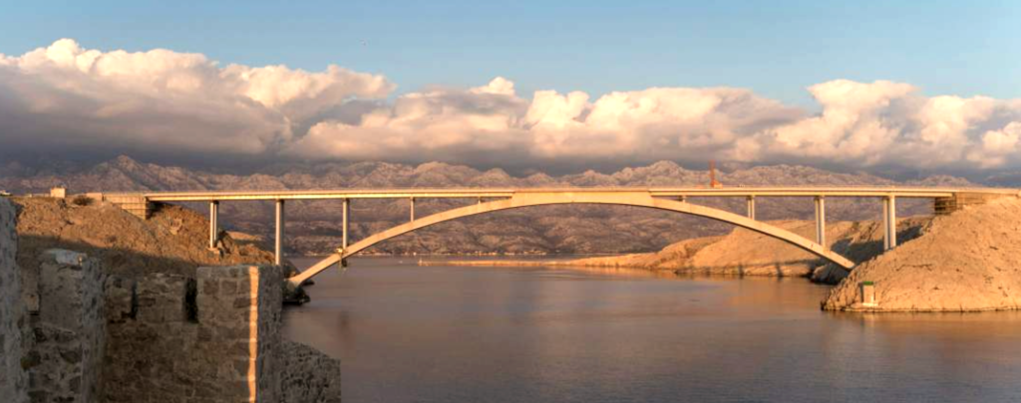 Die Krk-Brücke wurde im Juli 1980 eröffnet und verbindet das Festland bei Kraljevica mit der Insel Krk bei Omišalj. Der Bau erfolgte zwischen 1976 und 1980 und zählt bis heute zu den bedeutendsten Infrastrukturprojekten Kroatiens. Mit einer Länge von rund 1,4 Kilometern und einer Höhe von etwa 60 bis 70 Metern gehört sie zu den beeindruckendsten Brückenbauwerken der Region. Besonders bemerkenswert ist der Hauptbogen mit einer Spannweite von 390 Metern, der zur Zeit der Fertigstellung zu den größten Betonbögen weltweit zählte. Die Brücke verläuft über die kleine Insel Sveti Marko und verbindet so das Festland mit Krk.