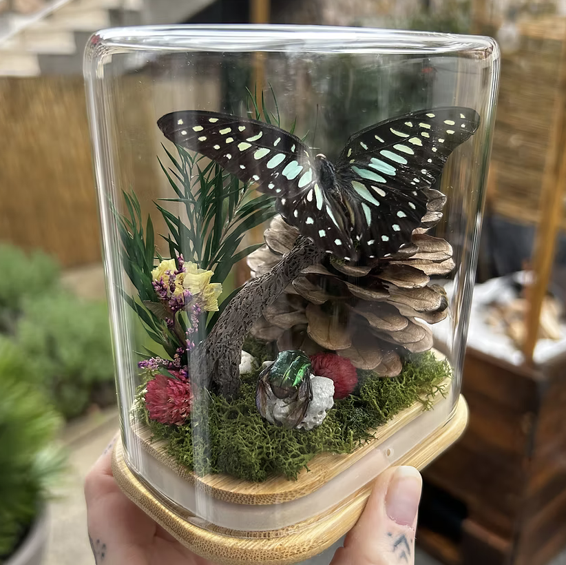 From delicate insects in elegant glass domes to carefully arranged bones, skulls and natural elements, every creation tells its own unique story.